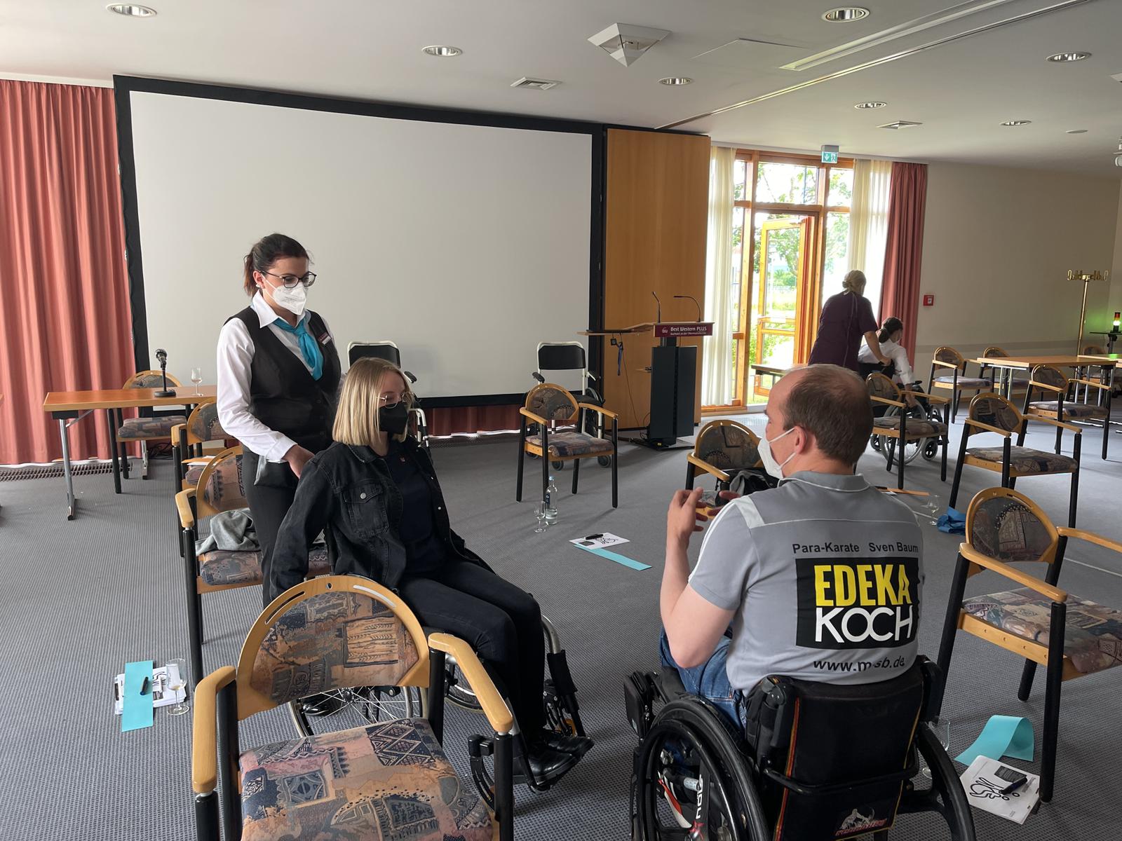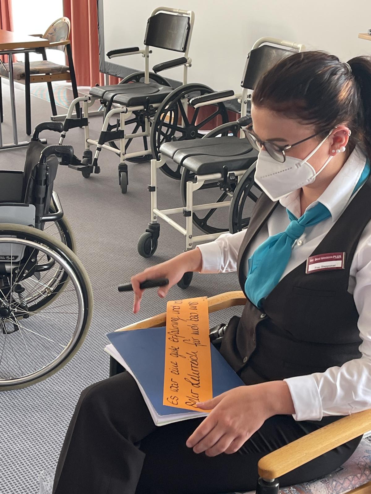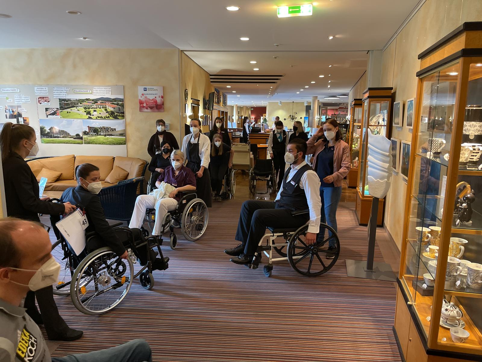 Die Aufgabe der Mitarbeiter war es, sich in den Rollstuhl zu setzen. Und mit dem Rollstuhl selbstständig das Hotel auf vier Rädern zu erkunden. Dabei mussten die Mitarbeiter mit dem Rollstuhl den Weg zu den barrierefreien Zimmern zurücklegen. Außerdem war es die Aufgabe mit dem Rollstuhl in die Bäder der barrierefreien Zimmer zu fahren und sich bewusst, auch mal vor das Waschbecken und an den Duschsitz zu stellen. Beim umsetzen vom Stuhl beziehungsweise Bett auf den Rollstuhl, war es nicht gestattet die Beine zu benutzen. Das durchfahren der Zimmertür hat sich schon als Herausforderung herausgestellt.